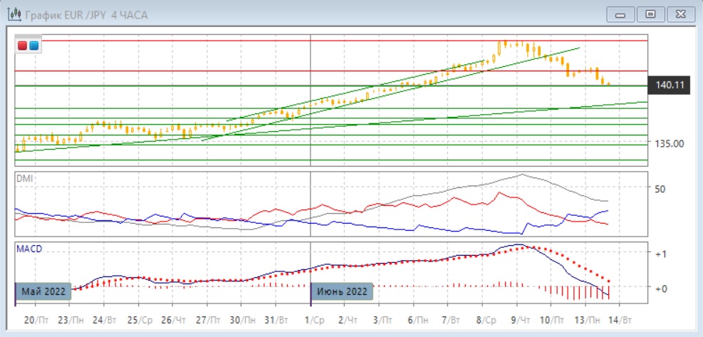 На четырёхчасовом графике пара перешла к снижению: линия тренда преодолена, относительные максимумы и минимумы сейчас снижаются, по индикаторам направленного движения тендецнией стало снижение: DM- теперь выше DM+, гистограмма MACD находится в отрицательной зоне, линия MACD имеет отрицательный наклон. Потенциальной целью снижения является линия тренда. Уровень 138 также близок цели измеренного движения, исходя из равенства волн снижения с 9 и с 13 июня.