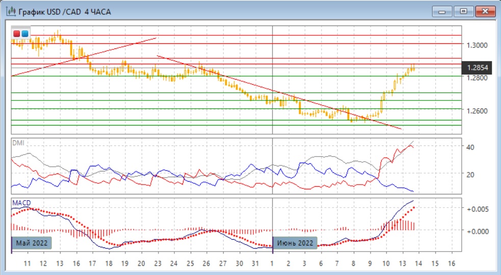 На четырёхчасовом графике тенденция роста стала сильной: откатов не видно, это показывает отсутствие сейчас поддержки для снижения даже в виде коррекции, пара легко преодолела три "круглых" уровня. По индикаторам направленного движения рост является сильной тенденцией: превышение DM+ над DM- очень большое, гистограмма MACD находится в положительной зоне, линия MACD имеет положительный наклон. Сейчас рост приостановился у уровня сопротивления во второй половине мая 1,2875. Учитывая отсутствие отката, пока пара выше 1,2800, продолжение роста кажется более вероятным.