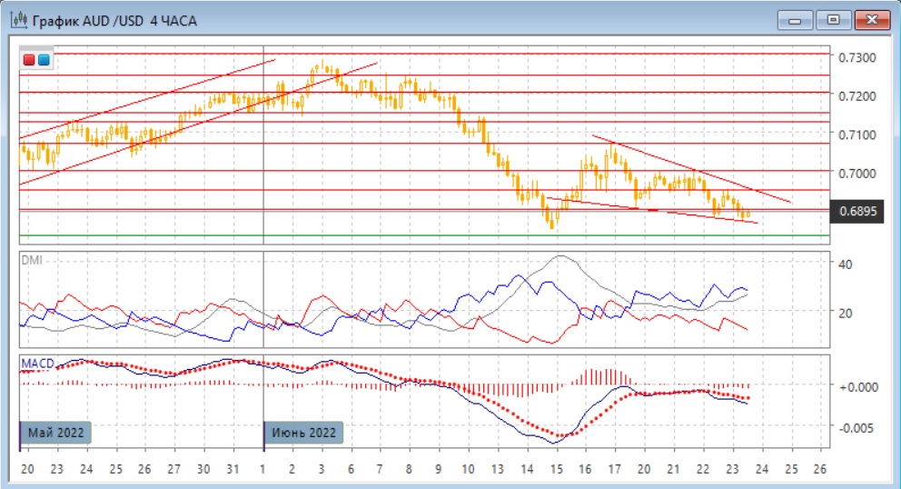 На четырёхчасовом графике волна уровень 0,6900 можно рассматривать уже как сопротивление Относительные максимумы и минимумы пары с 16 июня снижаются. Так как пара преимущественно движется между "круглыми" уровнями, преодоление 0,6900 может предполагать дальнейшее снижение. Сейчас кажется более вероятным, что пара достигнет предыдущего минимума июня. Однако отсутствие ускорения снижения и приближение к выходу из треугольника (если рассматривать движение с 15 июня как треугольник) потенциально укрепляет поддержку при приближении к предыдущему минимуму июня. Также в рамках движения в треугольнике возможно восстановление к сопротивлению на 0,6950, хотя это не изменило бы медвежью картину на графике.