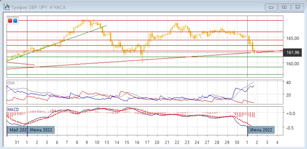 На четырёхчасовом графике движение ускоряется после преодоления уровне поддержки 164,45. Последующее быстрое преодоление уровней 163,40 и 162,30 показывает, что поддержка сейчас очень слабая, и направление наименьшего сопротивления движению хорошо видно. Скорее, снижение будет продолжаться. так как пока замедления движения не видно. По индикаторам направленного движения снижение стало сильной тенденцией: DM- значительно выше DM+, уровень ADX вырос, гистограмма MACD в отрицательной зоне, линия MACD имеет отрицательный наклон. Ближайшая цель на 161,10 - уровень поддержки в середине июня.