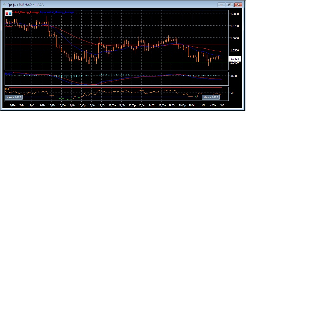 На торгах в Азии во вторник валютная пара EUR/USD торгуется с понижением котировок, оставаясь в пределах текущего уровня поддержки на 1.0400 при уровне сопротивления на отметке 1.0539. Четырёхчасовой график развивается ниже экспоненциальных скользящих средних, демонстрируя медвежий потенциал текущей рыночной тенденции в краткосрочной перспективе.