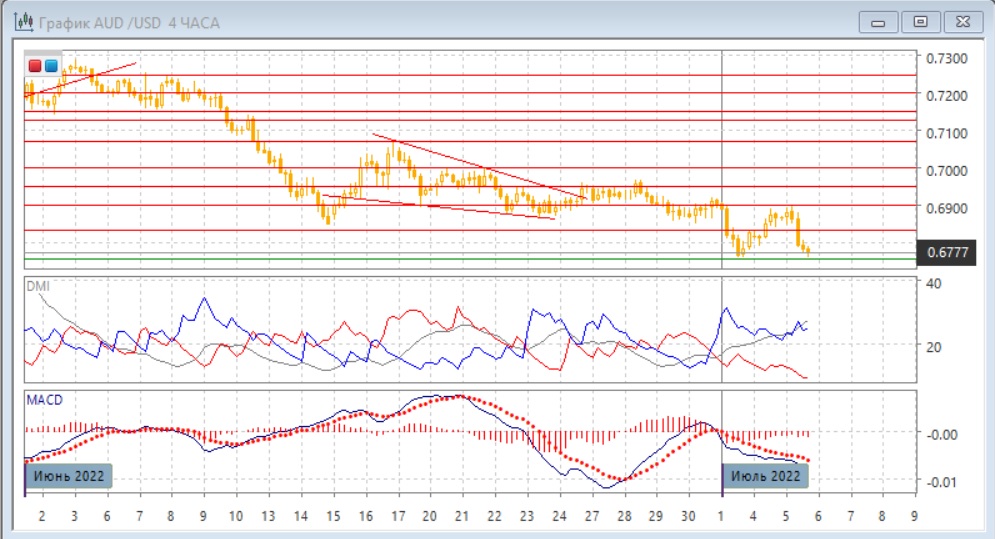 На дневном графике после отскока вверх пара не удержалась выше уровня 0,6835. Возвращение пары ниже этого ключевого уровня поддержки (у майского и июньского минимумов) показывает, что снижение, вероятно, будет продолжаться. По индикаторам направленного движения тенденцией остаётся снижение: DM- значительно выше DM+, уровень ADX растёт, гистограмма MACD находится в отрицательной зоне, линия MACD имеет отрицательный наклон.