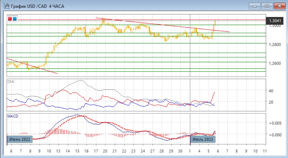 На четырёх часовом графике пара выросла выше психологически важного уровня 1,3000. При этом она преодолела линию нисходящего тренда, если строить её с 17 июня, и уровень верхней границы диапазона 1,2875-1,3000. Это бычьи сигналы. Сильный рост после намного более умеренных движений также является бычьим сигналом, так как показывает, что у рынка появился импульс - и, как правило, он сохраняется в краткосрочной перспективе. По индикаторам направленного движения тенденцией стал рост: DM+ значительно выше DM-, гистограмма MACD выросла в положительной зоне, линия MACD получила положительный наклон - хотя по MACD движения не выходят за пределы колебаний в период движения в диапазоне. Сопротивление на 1,3050 может быть сильным, но при его преодолении движение может ускориться.