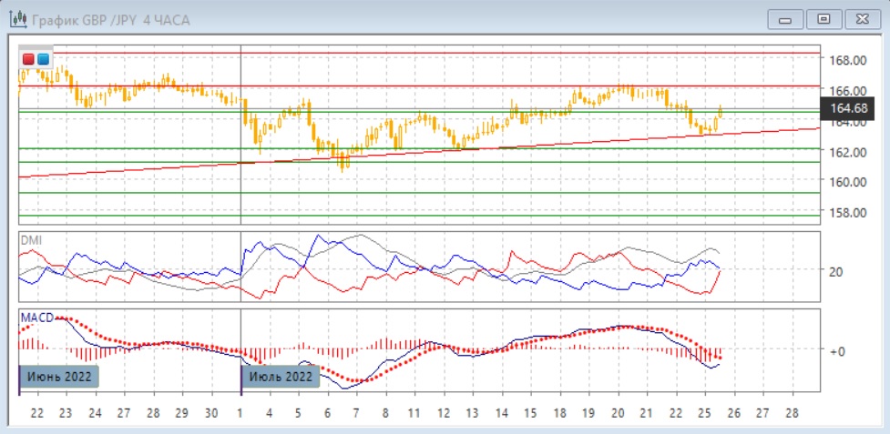 На дневном графике пара остаётся около линии тренда с марта. В зависимости от того, как его строить, пара или немного выше, или немного ниже линии тренда. Сохраняется движение в большом треугольнике с марта, образованного линий тренда и уровнем 168,40. Исходя из движения в треугольнике, более вероятен рост к верхней границе, так как пара выросла от нижней. Но то, что пара тяготеет к нижней границе с начала июля, делает выход из треугольника вниз более вероятным. По индикаторам направленного движения в этом масштабе флэт: DM+ и DM- близки при низком уровне ADX, гистограмма MACD колеблется около нуля.