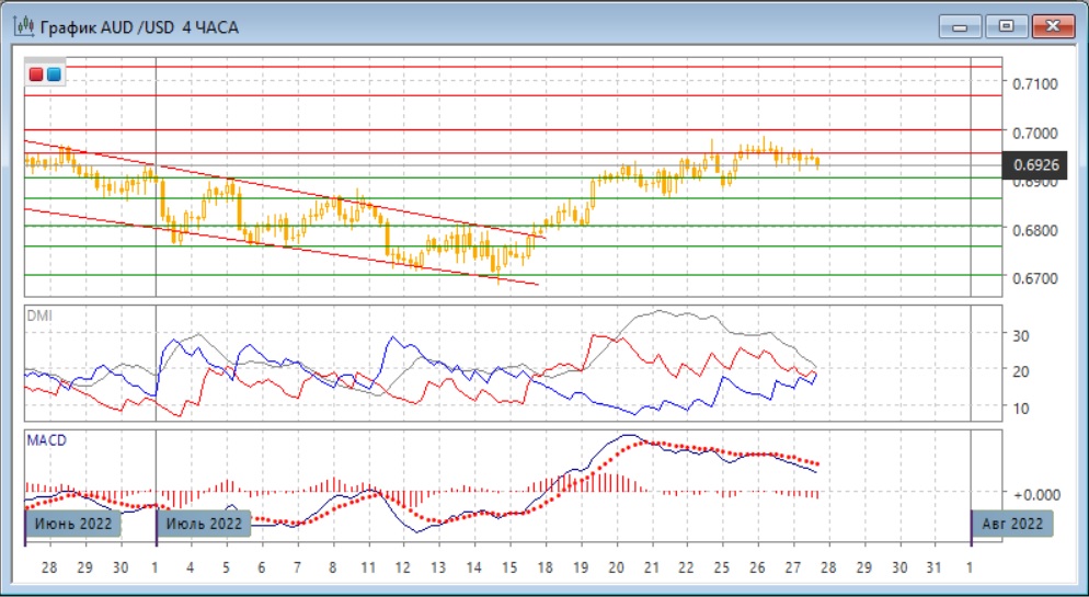 На четырёхчасовом графике рост замедляется. Это видно по уменьшению положительного наклона графика и образованию медвежьего расхождения максимумов пары и гистограммы MACD. Подтверждением сигнала расхождения может быть преодоление ближайшего "круглого" уровня 0,6900, но этого не произошло. Отскок пары вверх после приближения к 0,6900 может показывать, что разворота сейчас не будет, вместо этого после волны роста от 0,6700 будет боковик с последующим продолжением движения вверх.