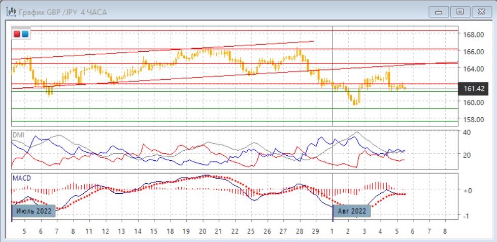 На четырёхчасовом графике пара находится в узком консолидации между 161,10 и 162,00. Так как это происходит после резкого снижения от 164,00, это выглядит коррекцией, которая была достаточно слабой, чтобы не привести к повышению уровня пары. Если рассматривать консолидацию как коррекцию к снижению, то более вероятно продолжение снижения с завершением коррекции вверх с минимума августа.