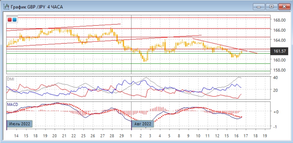 На четырёхчасовом графике пара приблизилась к линии тренда с 10 августа. Сопротивление на линии тренда усиливается расположенным рядом уровнем 162,00. Пока пара ниже зоны сопротивления и пока сохраняется снижение (относительные максимумы и минимумы последовательно снижаются), боле вероятно, что снижение возобновится. Преодоление зоны сопротивления (выход выше 162,00) может изменить картину. По ADX тенденция снижения остаётся сильной: DM- значительно выше DM+ при высоком уровне ADX.