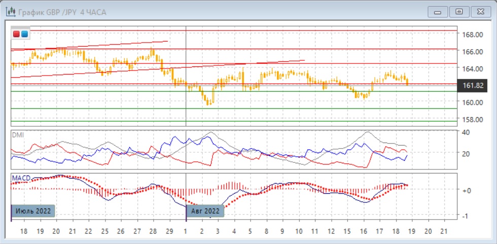 На четырёхчасовом графике пара снизилась от максимумов августа, и может преодолеть уровень 162,00. Это сохраняет пару в диапазоне месяца, и, исходя из движения в этом диапазоне, ближайшей целью является поддержка на 161,10. Если рассматривать более широкую картину, цель может быт ниже - около минимумов августа в районе 160,00.