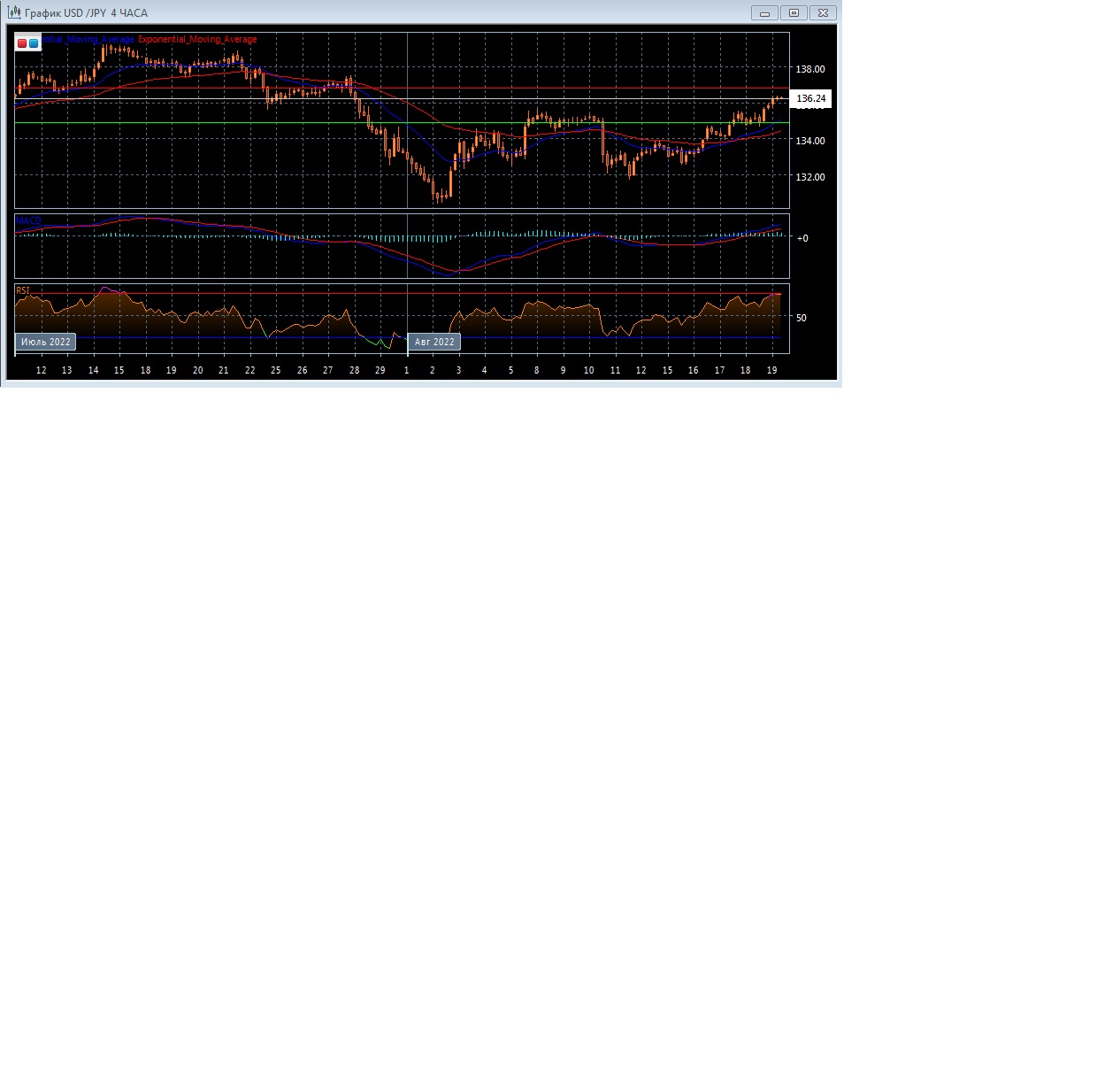 Скользящие средние с периодом 21 и 55 дней после формирования сигнала на покупку продолжают движение вверх, увеличивая расхождение, . Четырёхчасовой график прогрессирует в области заметно выше экспоненциальных скользящих средних, что свидетельствует о продолжении восходящего движения этого рынка в краткосрочной перспективе.