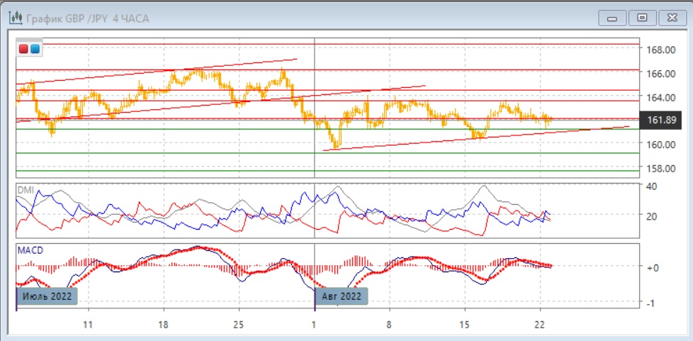 На четырёхчасовом графике пара находится у сильной зоны поддержки - рядом уровень 161,10 и линия тренда, если строить её по минимумам августа. При этом отскок вверх этой зоны поддержки продолжения не получил, и это может быть медвежьим сигналом. Уровень 161,10, вероятно, снова будет тестироваться. По индикаторам направленного движения флэт: DM+ и DM- пересекаются, уровень ADX снизился, гистограмма MACD около нуля.