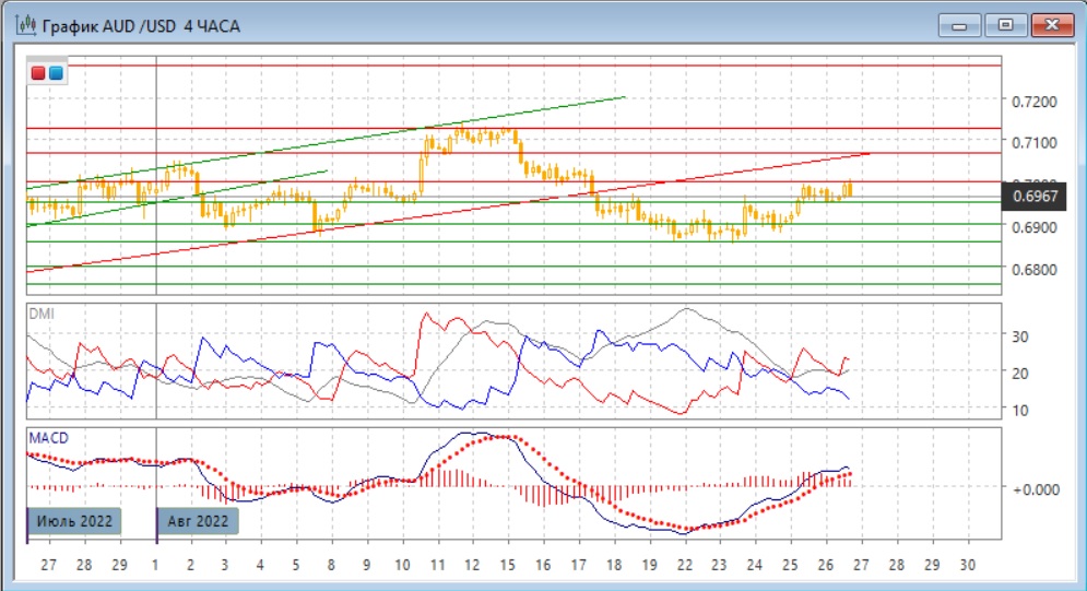 На четырёхчасовом графике пара находится в консолидации 0,6950-0,7000 после преодоления сопротивления на 0,6950, которое было ограничителем для пары с 17 августа. Дальнейшее движение, вероятно, будет в сторону выхода из консолидации. Сейчас более вероятно, что выход будет вверх, так как пара остаётся выше верхней границы диапазона 0,6860-0,6950 и тенденцией сейчас остаётся рост (относительные максимумы и минимумы последовательно растут). Однако до преодоления важного сопротивления на 0,7000 рассчитывать на него преждевременно, так как высока вероятность отката.