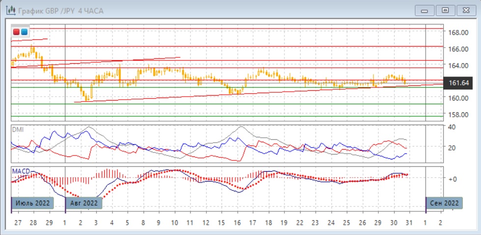 На четырёхчасовом графике пара остаётся около линии тренда. прорыв уровня сопротивления 162,00 развития не получил. Консолидация у нижней границы треугольника делает более вероятным выход из него вниз, но так как поддержка на линии тренда и уровне 161,10 сильная, рассчитывать на снижение до преодоления этой зоны было бы преждевременно.