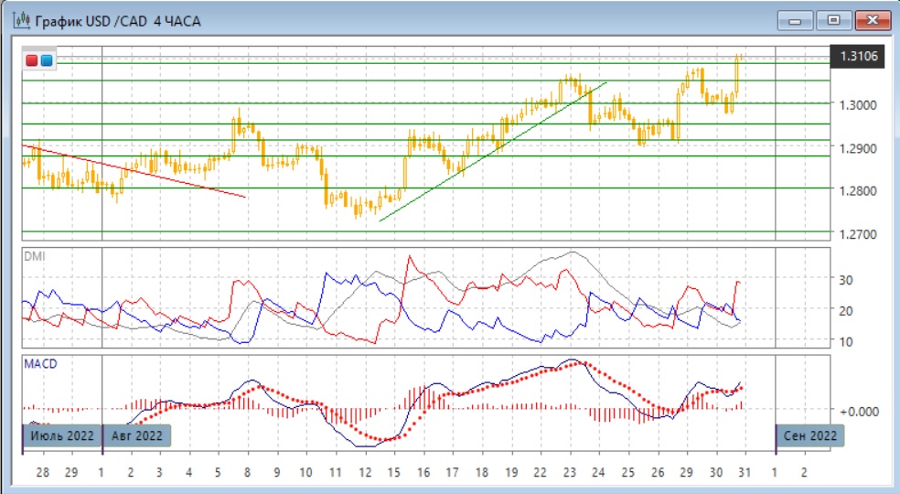 На дневном графике, кажется, будет закрытие выше следующего сильного сопротивления на 1,3050. Это выводит пару из долгосрочного диапазона и сделало бы следующей целью максимум июля около 1,3200. Признаков замедления движения сейчас не видно. По индикаторам направленного движения тенденция роста хорошо выражена: превышение DM+ над DM- большое, уровень ADX вырос, гистограмма MACD растёт в положительной зоне, линия MACD имеет положительный наклон.