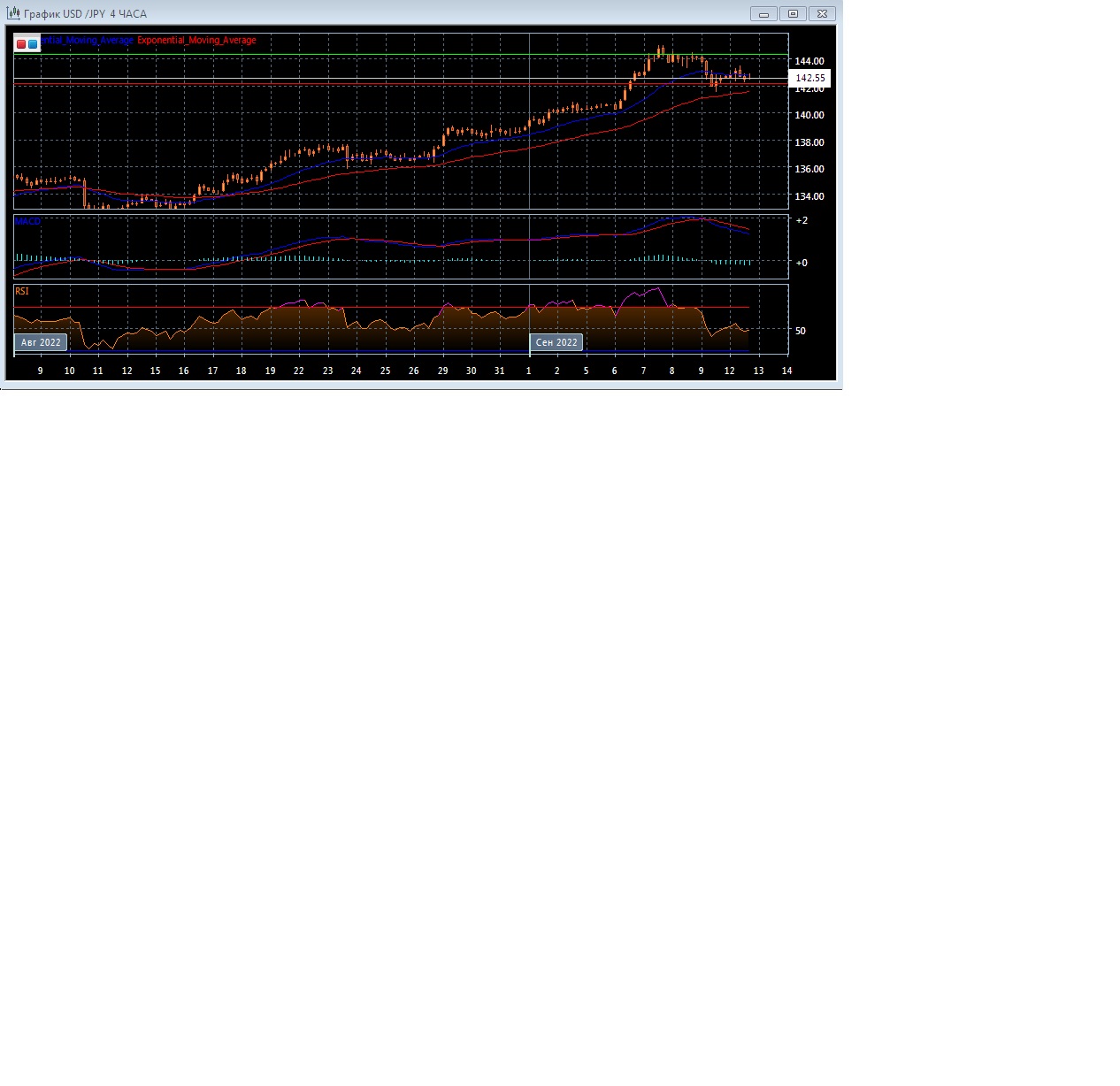 Скользящие средние с периодом 21 и 55 дней продолжают движение вверх, но замедлились и пока-что сокращают ощутимое расхождение. Четырёхчасовой график прогрессирует между экспоненциальных скользящих средних, что свидетельствует об окончании восходящего движения этого рынка в краткосрочной перспективе и зарождении нисходящего.