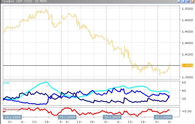 Фунт к 6 часам утра вырос против доллара до 1.3970, начав новый день с 1.3923. После открытия последовало недолгое боковое движение, после которого начался наблюдаемый в данный момент рост. Как показывают индикаторы, нисходящий тренд ослабляется с тем, чтобы уступить место восходящему: ADX снижается ниже 40 и уже почти достиг 30, кривая DI+ пересекает DI- сверху вниз, DI+ продолжает расти. Возможны так же колебания вблизи указанного уровня, если восходящий тренд не будет усиливаться.