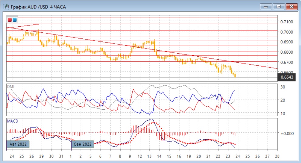 На дневном графике пара продолжила снижаться после преодоления поддержки на 0,6700. Также пара остаётся ниже нисходящей линии тренда с середины августа. Отсутствие близкой обоснованной поддержки, кроме как на "круглых" уровнях, облегчает сейчас снижение. Но с другой стороны, постепенно размер волны снижения приближается к 600 пунктам без существенных коррекций, а это уже много для пары. Пока признаков разворота нет, и более вероятно, что в краткосрочной перспективе снижение будет продолжаться. По индикаторам направленного движения тенденция снижения усиливается: превышение DM- над DM+ увеличилось, уровень ADX вырос, гистограмма MACD остаётся в отрицательной зоне, линия MACD сохраняет отрицательный наклон.