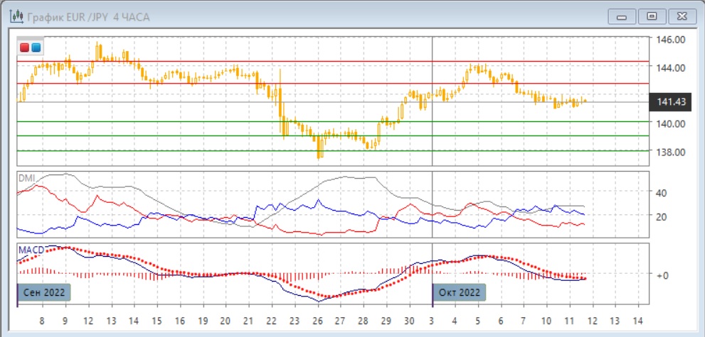 На четырёхчасовом графике пара стабилизировалась около уровня 141,40. Относительные максимумы снижаются, но снижение относительных минимумов прекратилось. Дальнейшее движение, вероятно, будет в сторону отхода от 141,40 - тогда определится картина, является ли снижение от 144,30 разворотом или коррекцией. По индикаторам направленного движения тенденцией остаётся снижение: DM- выше DM+, гистограмма MACD ещё в отрицательной зоне, линия линии MACD имеет отрицательный наклон.