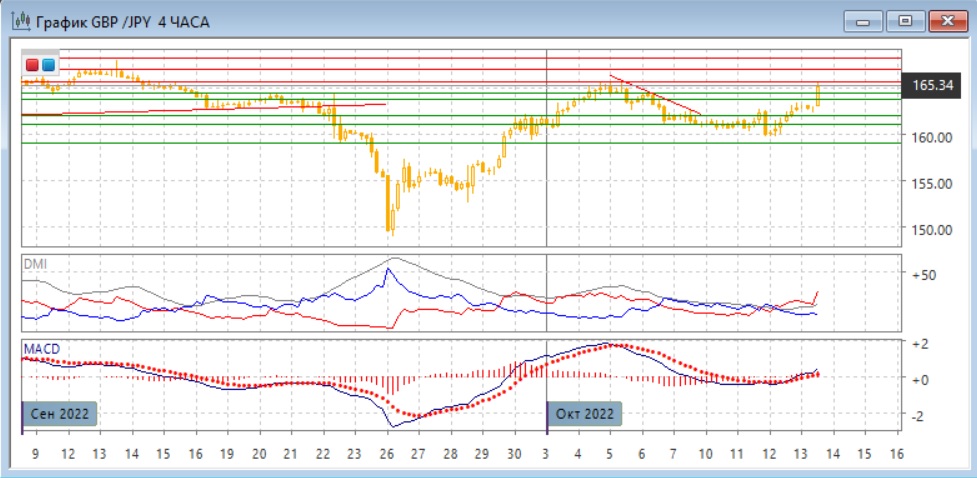 На четырёхчасовом графике произошёл разворот к росту, пара 13 октября легко преодолела пару уровней сопротивления и приблизилась к сильному сопротивлению на 165,70. Учитывая сильный импульс, более вероятно, что движение вверх будет продолжаться. Это привело бы к преодолению сильного сопротивления и открыло пространство дальнейшему повышению. По индикаторам направленного движения тенденцией стал рост: превышение DM+ над DM- увеличивается, уровень ADX восстанавливается, гистограмма MACD в положительной зоне, линия MACD получила положительный наклон.
