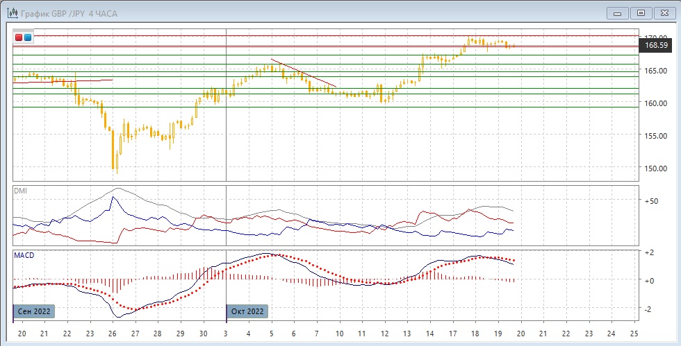 На четырёхчасовом графике пара находится во "флаге" 168,35-170, это вторая остановка в волне роста с 13 октября. Исходя из флага как модели продолжения тенденции, более вероятен выход вверх и, краткосрочно, достижение верхнего уровня 170,00. Однако преодоление сопротивления на 168,35 может изменить картину и дать сигнал о снижении в краткосрочной перспективе. Уже образовался более низкий, чем предыдущий относительный минимум. Сейчас скорее надо подождать фактического выхода пары из флага и действовать в направлении этого выхода. При снижении целью может быть сильный уровень поддержки на 165,75.