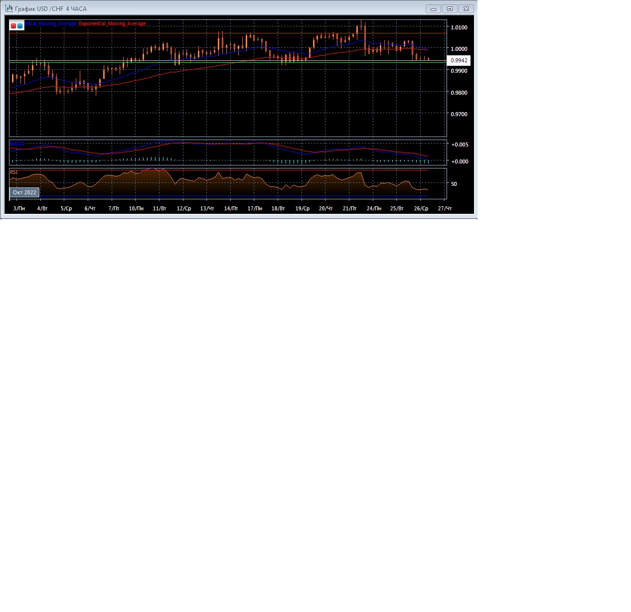 На четырёхчасовом графике скользящие средние с периодом 21 и 55 замедлились, развернулись вниз, сократив расхождение до минимального и вероятно сформируют сигнал на продажу, что говорит в пользу медвежьей направленности данного рынка. Четырёхчасовой график котировок прогрессирует ниже экспоненциальных скользящих средних, что так же является свидетельством нисходящей тенденции рынка в краткосрочной перспективе.