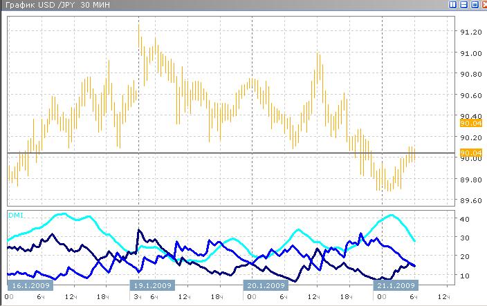 Индикаторы показывают, что в течение вчерашнего вечера пара показывала сильный нисходящий тренд, который сегодня резко ослабился, а после этого развернулся. Таким образом, достигнув минимума на уровне 89.80, доллар сегодня начал расти против йены и уже вырос до уровня 90.05. Пересечение кривых DI-/DI+ в точке разворота тренда указывали на то, что можно покупать доллары за йены. В дальнейшем сегодня предполагается либо рост пары до уровня 90.40 и выше, либо колебания вблизи установившегося пока что значения 90.05.