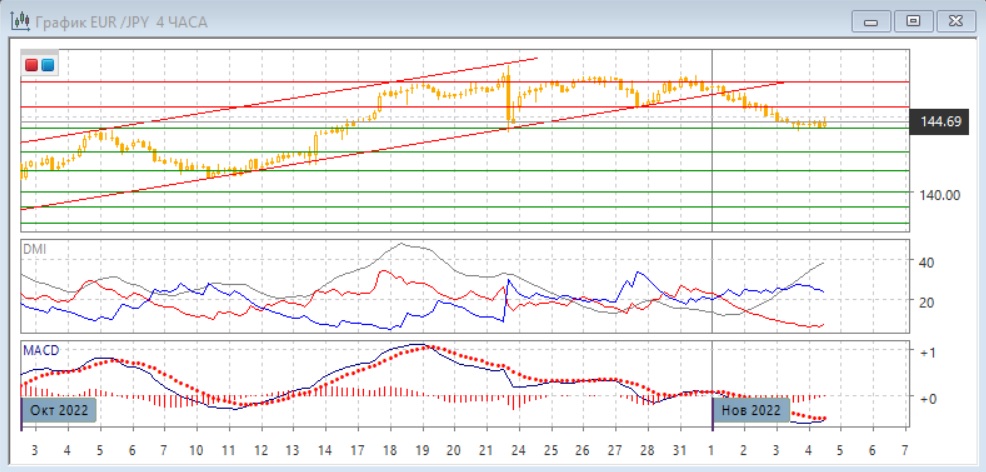 На четырёхчасовом графике снижение приостановилось у сильного уровня поддержки 144,30, 3 и 4 ноября продолжается консолидация в узком диапазоне выше этого уровня. Отсутствие отскока вверх может быть медвежьим сигналом, так как показывает отсутствие поддержки даже для коррекционного движения при достижении сильного уровня. С другой стороны, то, что тестирование пока было неудачным, усиливает поддержку на уровне. Дальнейшая перспектива, вероятно, будет зависеть от того, преодолеет ли пара уровень 144,30: если да, то стоит ожидать продолжения снижения, отскок может привести пару к ближайшему сопротивлению на 145,65, и, так как оно находится близко, и к возвращению в диапазон второй половины октября 145,65-147,35. По индикаторам направленного движения коррекция к снижению: превышение DM- над DM+ большое, уровень ADX вырос, коррекция видна по развороту линии MACD и по росту гистограммы MACD.