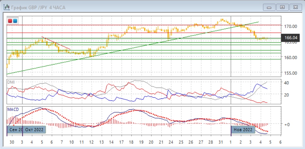 На четырёхчасовом графике снижение приостановилась у сильного уровня поддержки 165,75. Отскока вверх не было, и это может быть медвежьим сигналом, так как показывает, что поддержки сейчас не хватает и для коррекционного отскока. С 31 октября снижение ускорялось, а не замедлялось, и это не делает разворот более вероятным - скорее, снижение продолжился даже если коррекция вверх произойдёт. При отскоке вверх недалеко сильное сопротивление на 167,60, где он может быть ограничен. По индикаторам направленного движения тенденция снижения сильная: превышение DM- над DM+ большое, ADX на высоком уровне, гистограмма MACD находится в отрицательной зоне, линия MACD имеет отрицательный наклон.