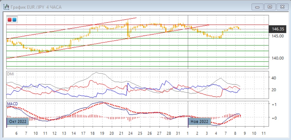 На дневном графике отскок вверх от уровня поддержки 144,30 был ограничен сильным сопротивлением на 147,35 - этот уровень выдержал неоднократное тестирование в октябре. Рост пары, однако, образует предполагаемый диапазон 144,30-147,35, так как обе этих границы показали себя сильными поддержкой и сопротивлением. В рамках движения в этом диапазоне более вероятным видится снижение к нижней границе на 144,30. Если рассматривать рост от 144,30 как коррекцию вверх после выхода пары из восходящего канала с конца сентября, с приближением к ранее преодолённой линии тренда также более вероятно возобновление роста.