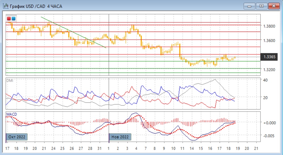 На четырёхчасовом графике отскок вверх был ограничен следующим "круглым" уровнем 1,3400, но при откате от него пара получила поддержку на ближайшем "круглом" уровне 1,3300. Таким образом, влияние "круглых" уровней сохраняется. При росте от 1,3300 пара может вновь встретить сопротивление на 1,3400. Краткосрочно пара перешла к росту, так как относительные максимумы и минимумы с 15 ноября повышаются. По индикаторам направленного движения тенденцией также стал рост: DM+ теперь выше DM-, гистограмма MACD в положительной зоне, линия MACD имеет положительный наклон. Но при достижении 1,3400, вероятно, образуется медвежье расхождение максимумов пара и гистограммы MACD, что укрепляло бы сопротивление на 1,3400 и увеличивало вероятность отката.