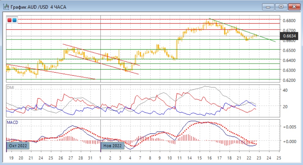 На четырёхчасовом графике пара продолжается последовательное снижение от 0,6800. Сейчас пара при отскоке вверх от 0,6600 достигла краткосрочной линии тренда, которая находится близко к минимуму 17 ноября около 0,6630. Это укрепляет сопротивление на этом уровне, однако при прорыве этой зоны пара может вернуться к следующему "круглому" уровню 0,6700. Образовалось бычье расхождение минимумов пары и гистограммы MACD, это показывает замедление снижения и увеличение вероятности отскока вверх или разворота. В более широкой картине снижение остаётся коррекционным, и рост, вероятно, возобновится.