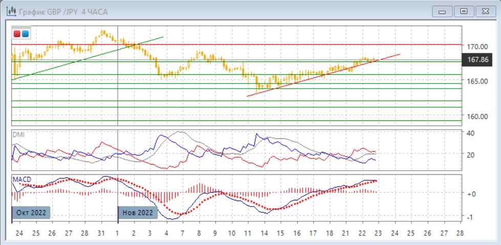 На четырёхчасовом графике рост от пара остаётся выше линии краткосрочного тренда с 11 ноября, но образовалось медвежье расхождение максимумов пары и гистограммы MACD. Это увеличивает вероятность прорыва линии тренда. Однако для расчёта на снижение необходимо дождаться, когда пара закрепится ниже линии тренда.