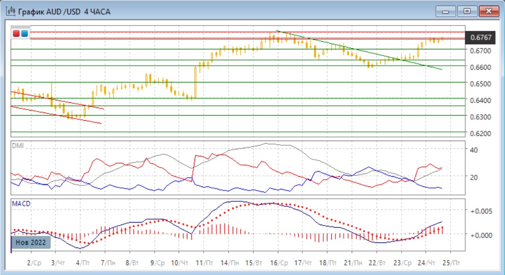 На четырёхчасовом графике пара приблизилась к максимумам ноября у "круглого" уровня 0,6800. Более вероятным кажется, это этот уровень сейчас будет достигнут, так как коррекция от 0,6800 почти завершилась, и откат от сопротивления на 0,6760 не произошёл. Ранее пара легко преодолела "круглый" уровень 0,6700, это показывает, что поддержка для роста сейчас сильная. По индикаторам направленного движения тенденцией стал рост: превышение DM+ над DM- большое, уровень ADX вырос, гистограмма MACD находится в положительной зоне, линия MACD имеет положительный наклон.