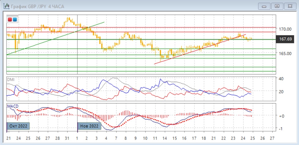 На четырёхчасовом графике пара преодолела краткосрочный восходящий тренд с 11 ноября. Потенциально это может привести к более существенному снижению, если пара останется ниже линии тренда. Разворот произошёл около уровня максима 7-8 ноября 169,20. Сопротивление там должно укрепиться. Для продолжения снижения необходимо преодоления уровня поддержки 167,60.