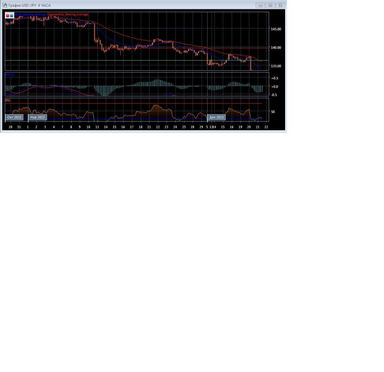 Скользящие средние с периодом 21 и 55 дней продолжают движение вниз, ускорились и увеличивают расхождение, демонстрируя укрепление медвежьей тенденции. Четырёхчасовой график прогрессирует заметно ниже экспоненциальных скользящих средних, что так же свидетельствует в пользу нисходящего движения этого рынка в краткосрочной перспективе.