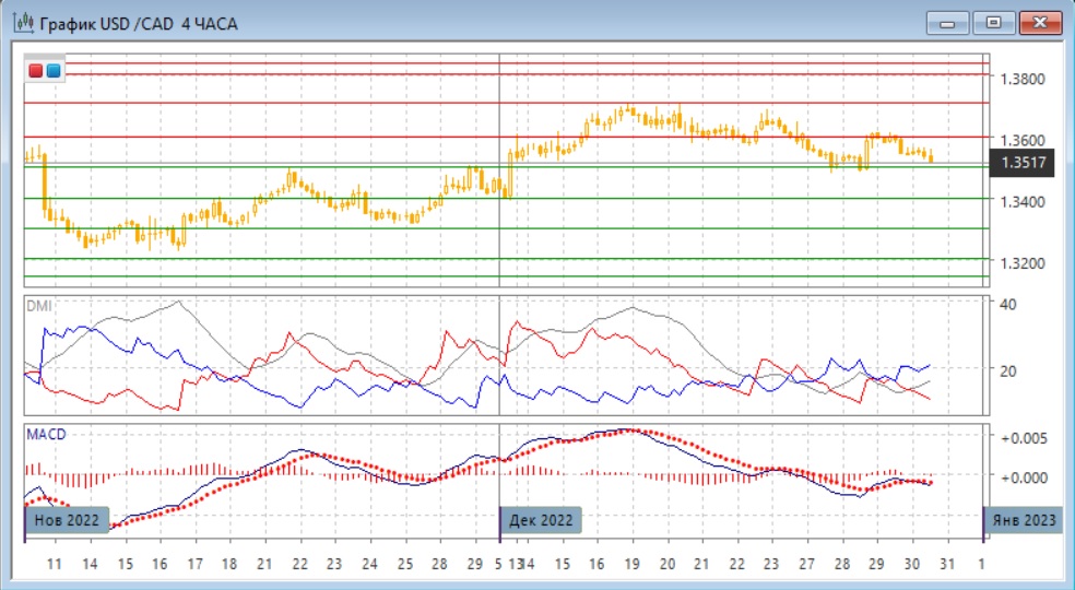 На четырёхчасовом графике последовательное снижение сохраняется, хотя оно и относительно слабое. Относительные максимумы пары с 19 декабря снижаются. при отскоке вверх от "круглого" уровня 1,3500 пара встретила сопротивление на ближайшем следующем, у 1,3600. Движение пары между "круглыми" уровнями предполагает, что уровень 1,3500, скорее, будет достигнут. Но при этом образовалось бы бычье расхождение минимумов пары гистограммы MACD, что укрепляет поддержу на 1,3500. При прорыве ниже 1,3500 следующей целью видится следующий "круглый" уровень 1,3400.
