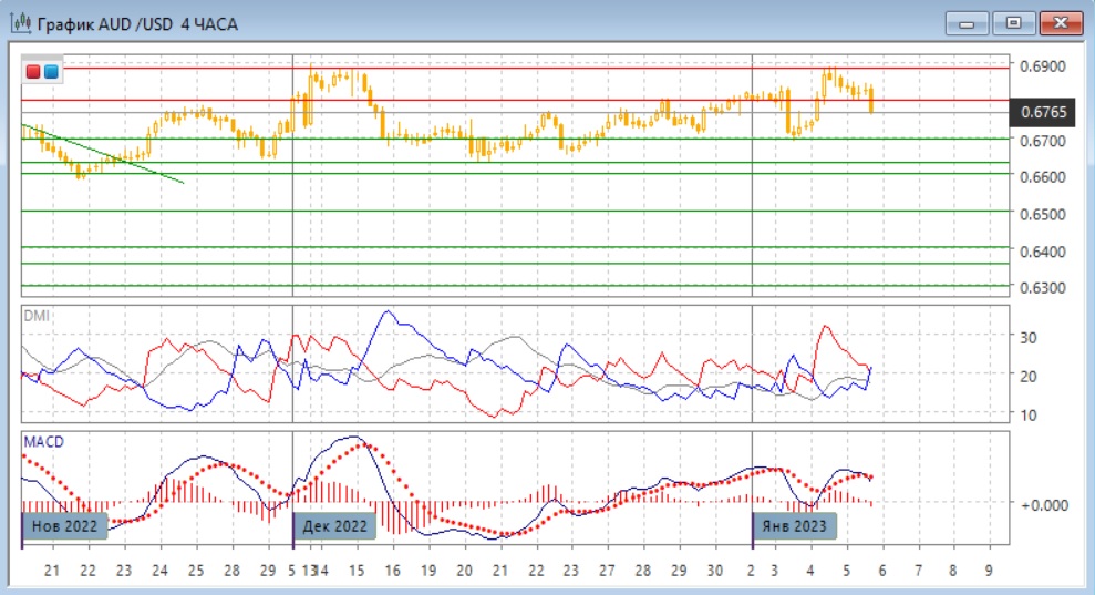На четырёхчасовом графике пара остаётся в широком диапазоне 0,6630-0,6890. Достаточно резкое снижение от верхней границы делает более вероятным дальнейшее снижение в рамках диапазона, ближайшей целью в этом случае видится уровень 0,6700 (ближайший "круглый" уровень и важная поддержка/сопротивление в декабре и в январе). По индикаторам направленного движения в этом масштаба флэт: DM- и DM+ пересекаются, ADX на относительно низком уровне, гистограмма MACD продолжает колебания около нуля, также меняет направление и линия MACD.