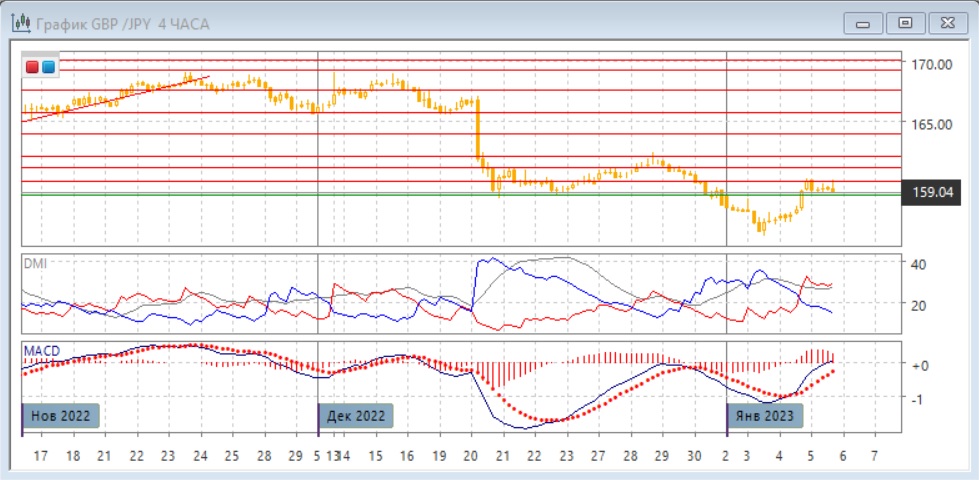 На четырёхчасовом графике сопротивлением является уровень 160,00, это примерно середина диапазона середины декабря. Нижняя границу того диапазона 158,85 является поддержкой на данный момент. Дальнейшее движение в краткосрочной перспективе, вероятно, будет в сторону выхода из текущего флага 158,85-160.