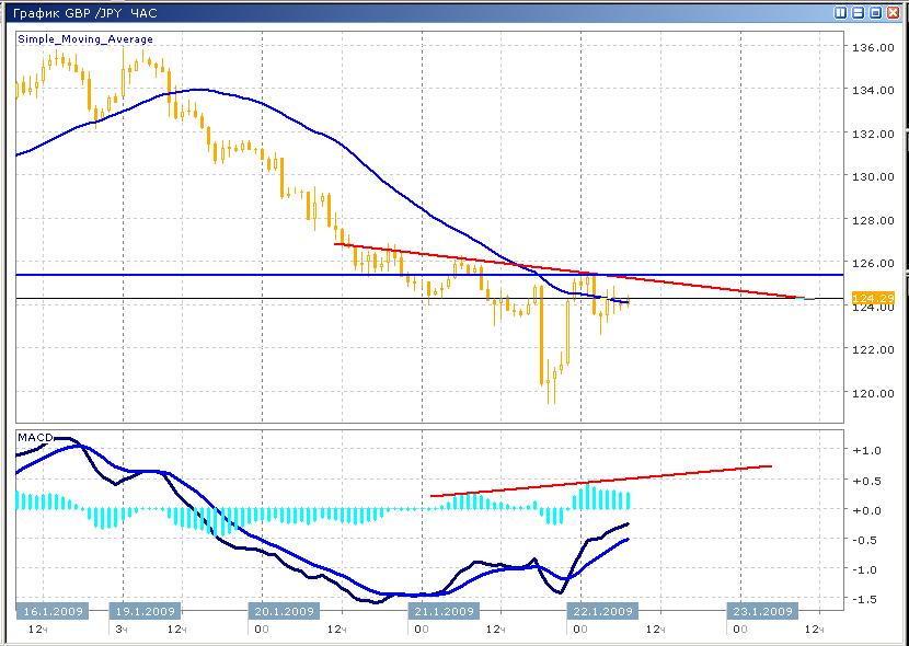 На часовом графике наблюдаем бычье схождение, между гистограммой MACD (12, 26, 9) и ценовым графиком. Этот сигнал, при подтверждении его другими индикаторами является достаточно точным. Однако, в данном случае на ценовом графике мы видим фигуру перевернутая голова-плечи, который косвенно подтверждает сигнал на покупку. В данный момент входить в рынок стоит с учетом обоих сигналов, выставив отложенный ордер на покупку у отметки 125.35, максимальный уровень второго плеча, и точка расхождения гистограммы MACD. Поскольку среднесрочная тенденция является медвежьей, ограничение убытков следует максимально приблизить к точке входа, на уровне 123.50. Целевой уровень роста пары расположен у отметки 127.40, как классический уровень разрешения графической фигуры на ценовом графике.