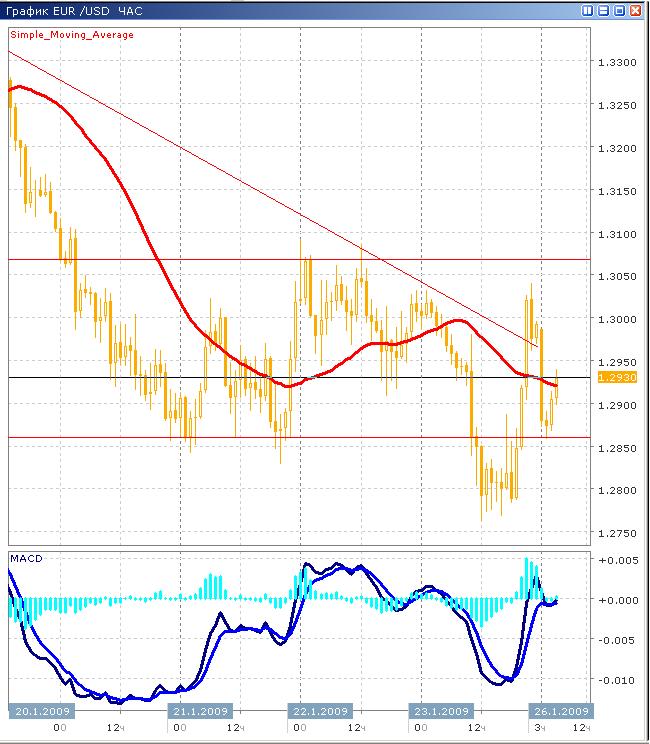 Торги протекают в условиях высокой волатильности, поэтому сигналы технических индикаторов стоит тщательно отслеживать, и дожидаться подтверждения их сигналами других индикаторов. В настоящий момент, ожидается краткосрочный рост пары EUR/USD, однако в среднесрочной перспективе пара находится под давлением как фундаментальных, так и технических факторов. Ожидается восстановление цен к уровню 1.2970, после чего вероятен отскок вниз от линии тренда. Гистограмма MACD продолжит снижение, и в конечном счете пересечет нулевую линию, ордер на продажу рекомендую на пробой минимальной цены свечи, соответствующей, пробившему нулевую линию столбику гистограммы.