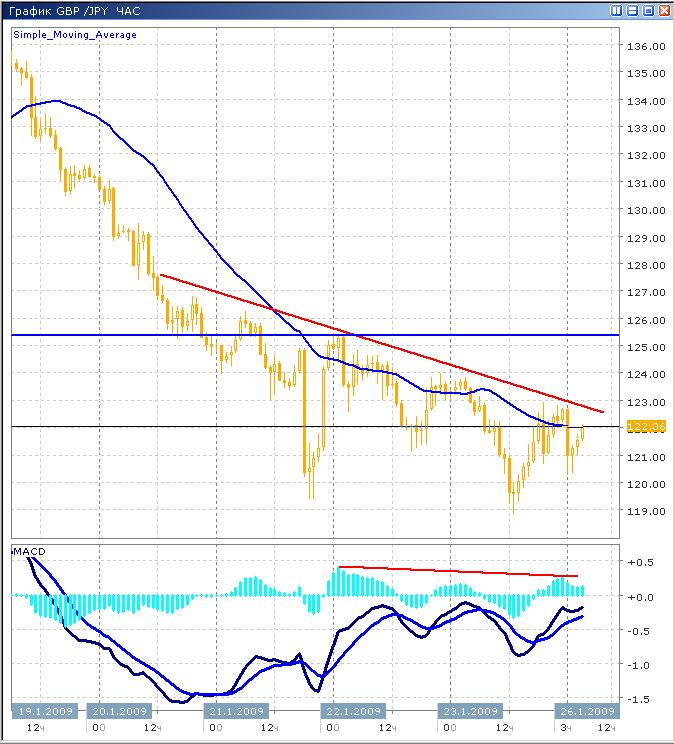 Развитие торгов было совершенно предсказуемо, пара продолжила снижение, торгуясь в среднесрочном медвежьем тренде. Моментум данной тенденции достаточно высок, при этом не наблюдается предпосылок его сокращения. Восстановление, которое мы наблюдаем в данный момент, с высокой долей вероятности, завершится вблизи нисходящей линии тренда. Выставляя ордер на продажу можно руководствоваться принципом сопротивления линии тренда росту цены, данными гистограммы индикатора MACD, в данном случае, продавая от пика. Кроме этого, на графике присутствуют скользящие средние ценового графика и гистограммы MACD. Целевой уровень входа: 122.80, цель снижение в среднесрочном плане: 119.50.