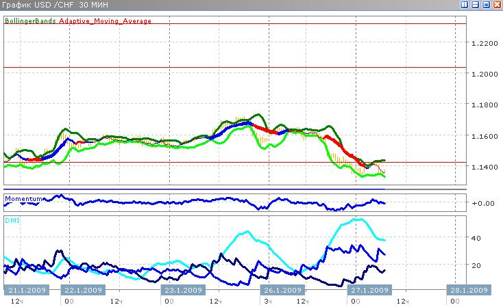 После открытия доллар несколько вырос против швейцарского франка (а именно до первого внутридневного максимума на уровне 1.1419), после чего снова упал приблизительно до первоначального уровня, и сейчас колеблется вблизи отметки 1.1350. Тренд нисходящий, достаточно сильный: показания индикатора ADX движутся вблизи уровня 40, DI- порядка 30 и превышает DI+. Таким образом, всё, видимо, указывает на то, что пара сегодня будет падать, и в этом случае может быть достигнут уровень 1.1250, что ознаменует очередной день достаточно серьёзных падений доллара против франка.