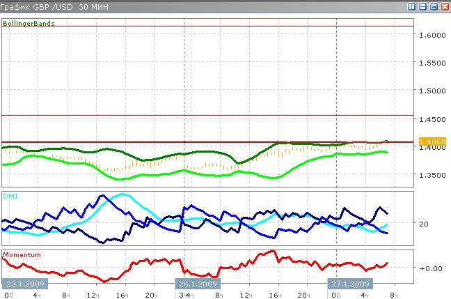 Упав до первого на сегодня внутридневного минимума, фунт вырос до 1.4044, и пока что продолжает колебания вблизи этого уровня, видимо, с тем, чтобы вскоре вырасти, так как индикаторы среднего направленного движения показывают усиливающийся восходящий тренд: кривая ADX растёт и скоро превысит отметку 20, показания DI- находятся ниже 15, а DI+ наоборот около 30. Поэтому, учитывая опыт предыдущих дней, можно ожидать, что фунт против доллара вырастет до нового уровня сопротивления 1.4500 и будет какое-то время торговаться вблизи него.