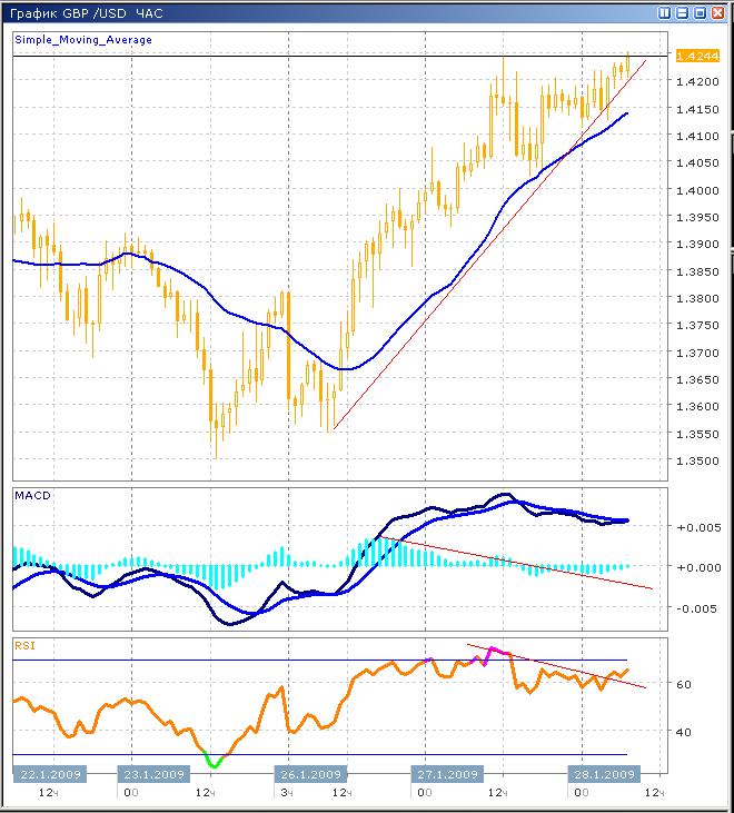 Пара демонстрирует уверенный рост на протяжении двух предыдущих сессий. Такая тенденция поддержана фундаментальными факторами, пришедшими из-за океана. Активный рост не может продолжаться бесконечно, быки начинают выдыхаться, о чем свидетельствуют расхождения ценового графика и двух индикаторов. Цена продолжает рост, в то время как гистограмма MACD снижается, приближаясь к нулевой отметке. Аналогичную динамику демонстрирует индекс относительной силы, выйдя из зоны перекупленности, когда цена тестировала максимум 1.4200, график индикатора направился вниз. Тем не менее по-прежнему сохраняется вероятность отскока вверх, при этом размещение длинных позиций не рекомендуется, поскольку глобальный тренд является медвежьим. Ключевая поддержка: 1.4050, ближайшее сопротивление: 1.4300.