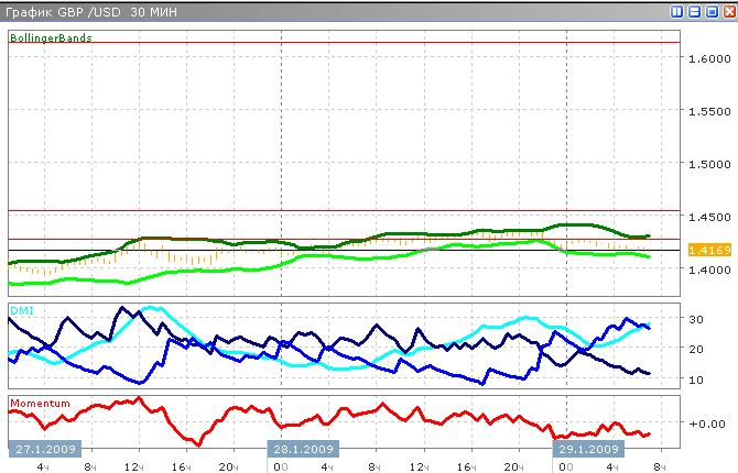 Фунт упал после того как вырос до первого внутридневного максимума (на уровне 1.4270) и колеблется сейчас вблизи уровня 1.4180. Индикаторы средненаправленного движения показывают усиливающийся нисходящий тренд. Ситуация в целом аналогична ситуации с eur/usd. Показания ADX движутся к 30, DI- в районе 25. Скорее всего пара продолжит колебания вблизи указанного уровня, достигая попеременно максимумов и минимумов на уровнях соответственно приблизительно 1.4300 и 1.4100, а к концу дня вернётся к уровню, близкому уровню открытия.