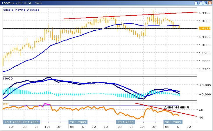 Бычий настрой рынка заметно угасает на протяжении последних двух торговых дней, при этом вчерашний день завершился формированием нового ценового пика, которому соответствует меньшая вершина индекса относительной силы, формирующая медвежье расхождение. Скользящая средняя с периодом 26 играет роль поддержки на протяжении последней сессии, в то время как цены колеблются в достаточно широком диапазоне с высокой активностью. Осциллятор MACD устойчиво развивается ниже нулевой оси, что дает надежду на быстрый разворот. Совершенно очевидно, что тренд находится в фазе переломного момента, при этом большинство сигналов указывают на смену направления тренда на противоположный. Ключевой уровень поддержки расположен у отметки 1.4100, сопротивление росту ожидается вблизи отметки 1.4340.