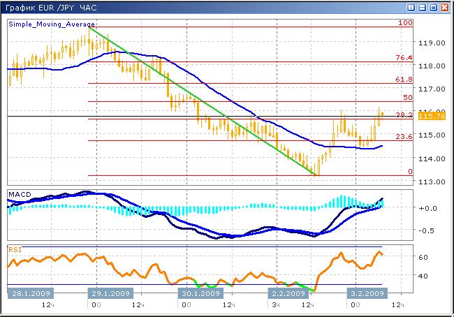 В настоящий момент наблюдаем корректирующее движение нисходящего тренда, которое, наиболее вероятно, еще не исчерпало свой ресурс. Цена в очередной раз тестирует уровень коррекции фибоначчи 38.2, при этом моментум бычьего тренда нарастает. Анализируя последнюю коррекцию, можно предположить, что текущая также продлится, по меньшей мере, до уровня фибоначчи 50. Осцилятор RSI находится в положительной зоне, что располагает к покупкам. MACD демонстрирует рост от нулевой оси, сигнализируя о продолжении восходящего краткосрочного тренда. Цель краткосрочного восхождения находится в диапазоне 116.40 — 117.20, после чего пара продолжит снижение.
