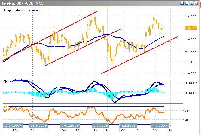 Активному росту, по всей видимости, пришел конец. Пара формирует локальный максимум, наращивая потенциал снижения. Поиск точек для входа в рынок нужно начать после формирования нового ценового максимума не превышающего уровень первого максимума 1.4490. Технические индикаторы сигнализируют о замедлении тренда. График индекса относительной силы коснувшись области перекупленности достаточно быстро потерял позиции, что часто случается при стремительном тестировании уровней сопротивления, которым в данный момент выступает цена 1.4490. Гистограмма осциллятора MACD приблизилась к нулевой оси, что говорит о падении силы быков, или по-меньшей мере, о приближении к локальной вершине. А учитывая, что глобальный тренд является нисходящим, а текущая коррекция затянулась, можно ожидать, достаточно активного снижения к сильному уровню поддержки 1.4260.