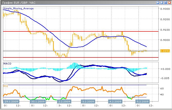 Торги по паре протекают с высокой волатильностью последние несколько недель, в противоположном, в отношении глобального тренда, направлении. Снижение достигло сильнейшего уровня поддержки 0.8850. Данный уровень уже неоднократно охлаждал пыл медведей, а в настоящий момент, накануне заседания Банка Англии по процентной ставке. Технические индикаторы сигнализируют о начале возрастающего тренда. Индекс относительной силы вышел из зоны перепроданности, приближаясь к отметке 50 пкт. Осциллятор MACD демонстрирует пересечение скользящих средних в направлении восходящего тренда, а его гистограмма уверенно пересекает нулевую ось.