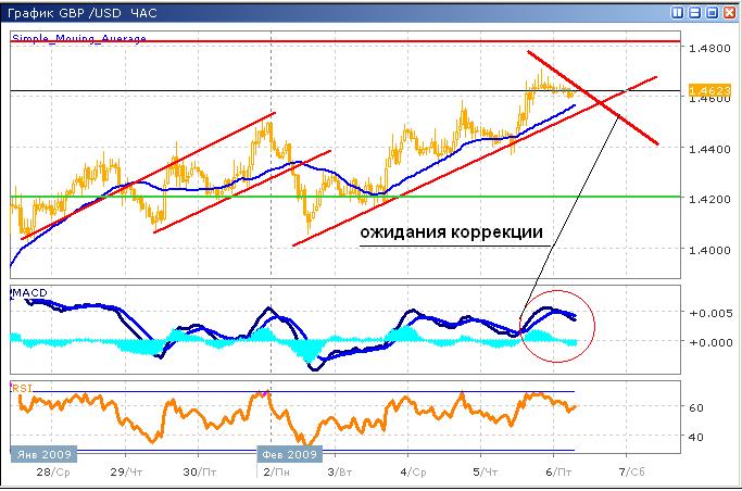 Пара демонстрирует классическую картину чередования роста и коррекций, однако, учитывая, что среднесрочный бычий тренд является корректирующим долгосрочного медвежьего, длинные позиции находятся под угрозой. В настоящий момент, бычий тренд выдыхается, технические индексы демонстрируют снижение движущей силы покупателей. Явных сигналов к продаже пока нет, анализируя часов график, поэтому для оптимального входа в рынок рекомендуем перейти на более мелкий таймфрейм, и идентифицировать разворот на нем. Гистограмма MACD сформировала локальный максимум, в то время как скользящие средние формируют сигнал на продажу. График RSI приблизился к зоне перекупленности, однако отметку 70 пкт не пересек.