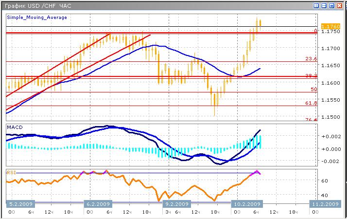 Швейцарский франк стремительно теряет позиции против доллара США, после достижения коррекционного движения уровня фибоначчи 61.8. В настоящий момент пара преодолела достаточно сильный уровень сопротивления 1.1740, который стал теперь поддержкой. Оптимизм быков поддержан фундаментальными факторами, однако текущей активности стоит остерегаться, поскольку, после резких рыночных бросков рынок становится мало прогнозируем. Технические индексы предупреждают о коррекции, RSI уверенно входит в зону перекупленности, MACD, который более значительно отстает от рынка показывает рост моментума бычьего тренда. Вход в рынок с текущих позиций будет рискован, однако глобальный тренд является возрастающим что является позитивным фактором для длинных позиций.